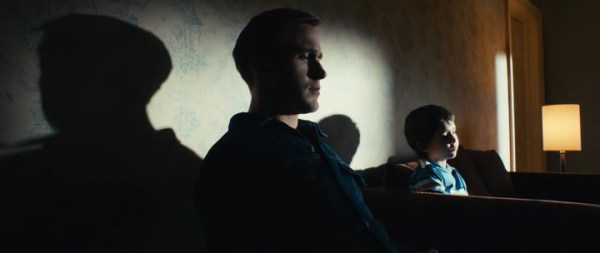In the following scene, with this father figure gone, the Driver is left to wander the supermarket like a kid lost where he sees his neighbor with her son. Car broken down, he comes to the aid of the stranded damsel and drives them back to their shared complex. He and the child share a gaze in the elevator without speaking: Benicio’s silence will also reoccur as a poignant reflection of the Driver, as well as wearing a Halloween mask as soon as they enter the apartment and being offered a toothpick by the taciturn Driver – later even shown wearing his jacket. But more than showing the inner-child, and perhaps reminding of himself, he also forms a domain for which the Driver feels a responsibility to protect: it gives him the chance to act as father himself and fill the gap that Shanon had for him. This idea is represented in the brief moment shared between the damsel turned love interest Irene (Carey Mulligan) in her apartment. As they talk a mirror on the back wall shows a large, shadowed figure looking over Benicio and his absent father, Standard.